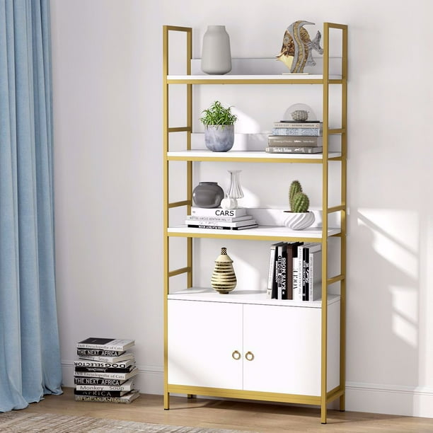 Tribesigns Gold Bookcase With Doors 4 Tier White Etagere Standard Bookshelf With Storage Cabinet Modern Book Shelves Display Shelf With Gold Metal Frame For Home Office White Walmart Com Walmart Com