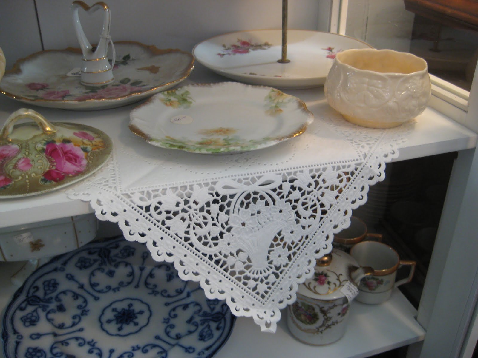 C Dianne Zweig Kitsch N Stuff Using Square Paper Lace Doilies To Trim A China Closet Shelf