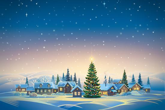Winter Festive Landscape With Village And Christmas Trees Raster Illustration Art Print Rustic Art Com