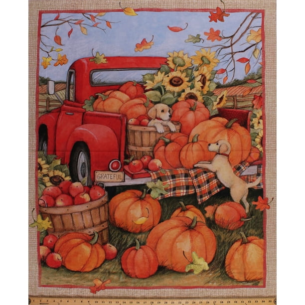36 X 44 Panel Fall Red Truck Pumpkins Harvest Fruit Vegetables Cute Puppies Sunflowers Grateful Autumn Leaves Thanksgiving Cotton Fabric Panel A6710 Walmart Com Walmart Com