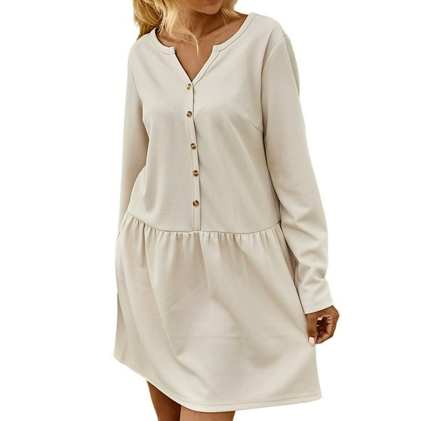 Fantadool Women Loose Quick Drying Beach Dress Casual Solid Color V Neck Long Sleeve Dress Apricot M Walmart Com Walmart Com