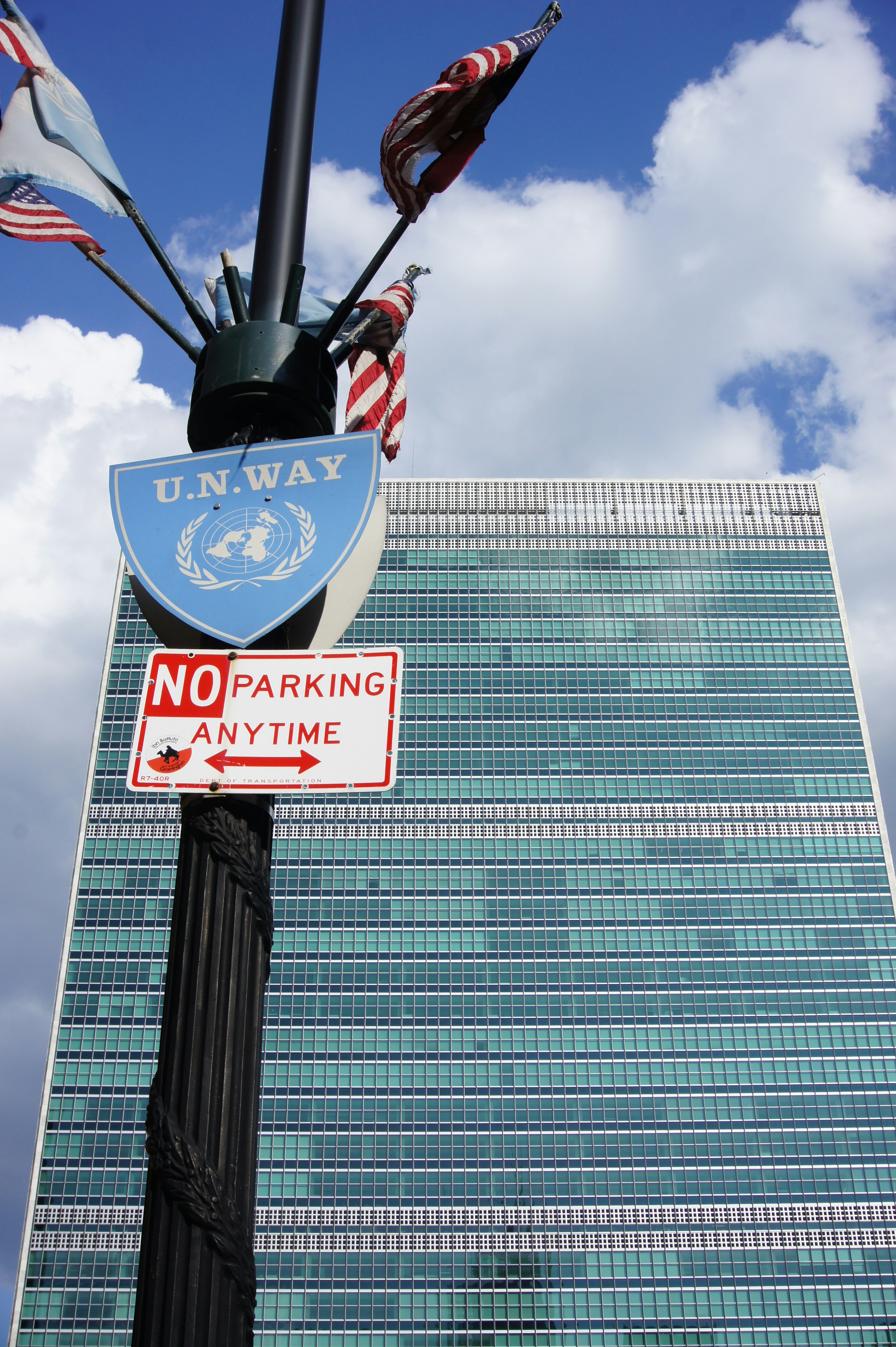 Lamp Post With Un And Us Flags In Front Of The Glass Facade Of The Stock Photo Alamy