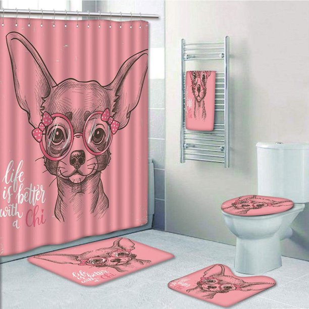 Prtau Dog Girl Chihuahua Sketch With Quote Fashion Glasses Ribbons Puppy 5 Piece Bathroom Set Shower Curtain Bath Towel Bath Rug Contour Mat And Toilet Lid Cover Walmart Com Walmart Com