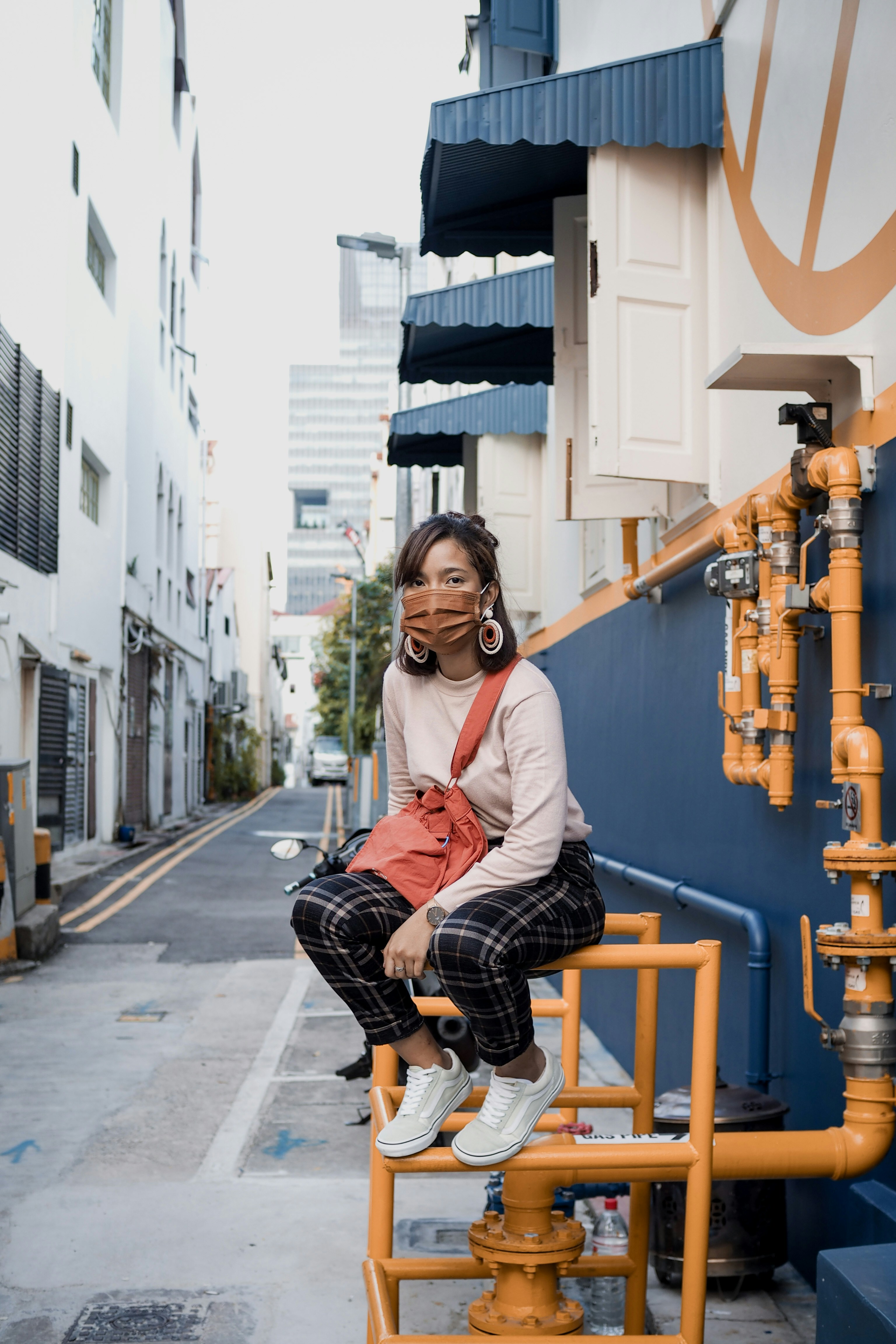 Woman In Red Cardigan Sitting On Yellow Metal Bench During Daytime Photo Free Apparel Image On Unsplash