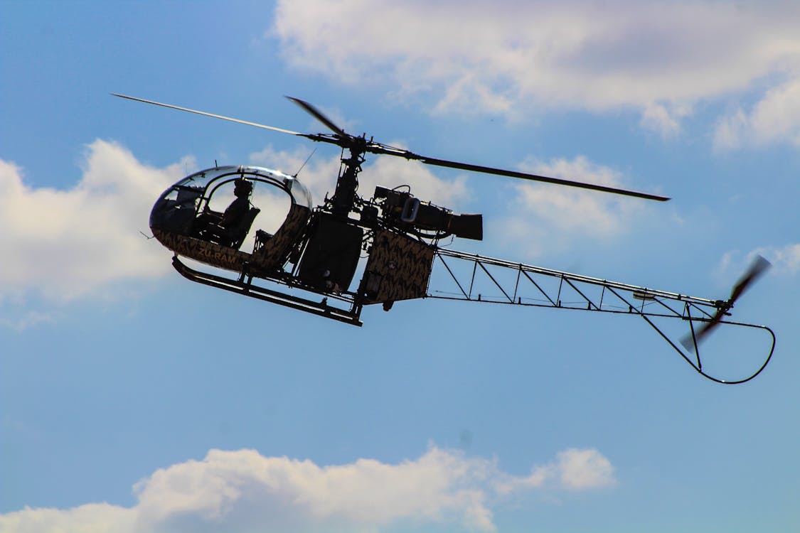 Black And White Helicopter Flying Under Blue Sky Free Stock Photo