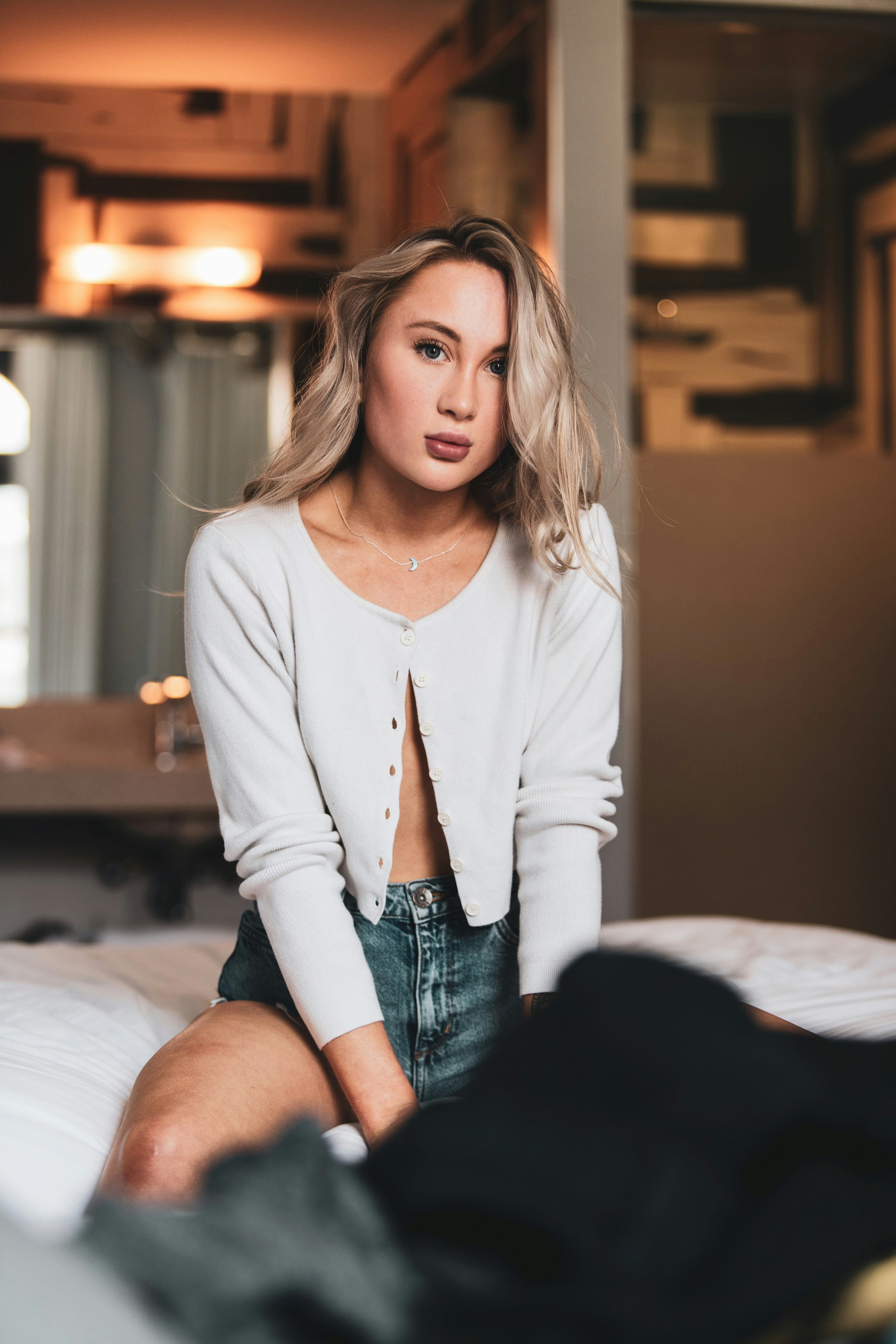 Woman In White Long Sleeve Shirt And Blue Denim Shorts Sitting On Bed Photo Free Apparel Image On Unsplash