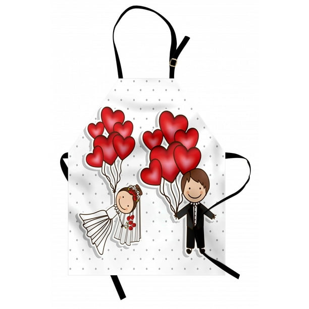 Wedding Apron Funny Cute Cartoon Style Newlyweds With Heart Shaped Balloons Dots Happiness Unisex Kitchen Bib Apron With Adjustable Neck For Cooking Baking Gardening Red White Black By Ambesonne Walmart Com