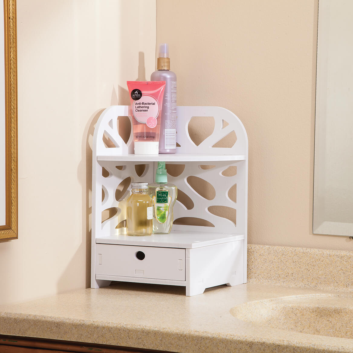 Fox Valley Traders Oakridge Corner Countertop Vanity Organizer With Drawer And Shelf White White On White