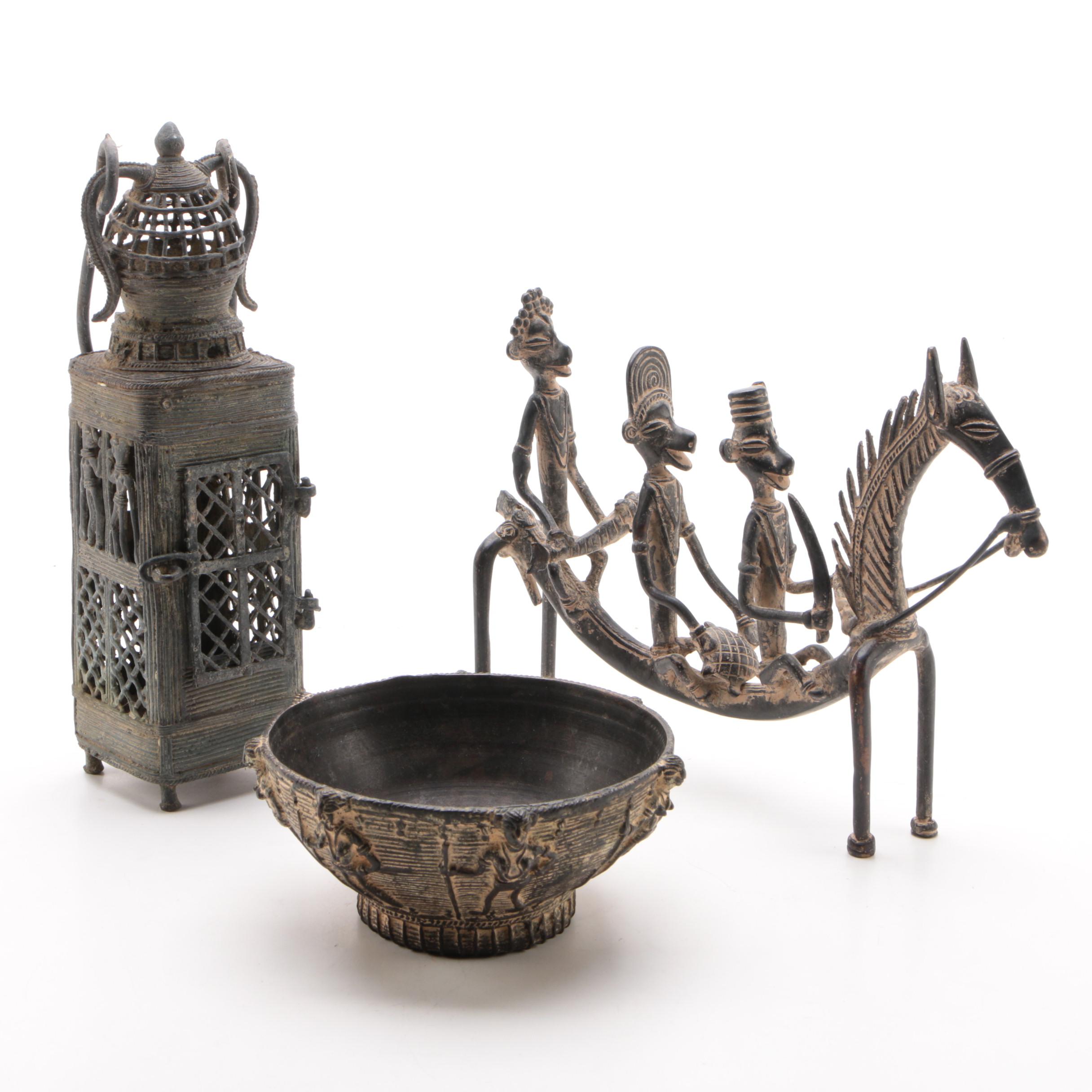 West African Ornate Bowl Horse Figurine With Riders And Metal Lantern Ebth