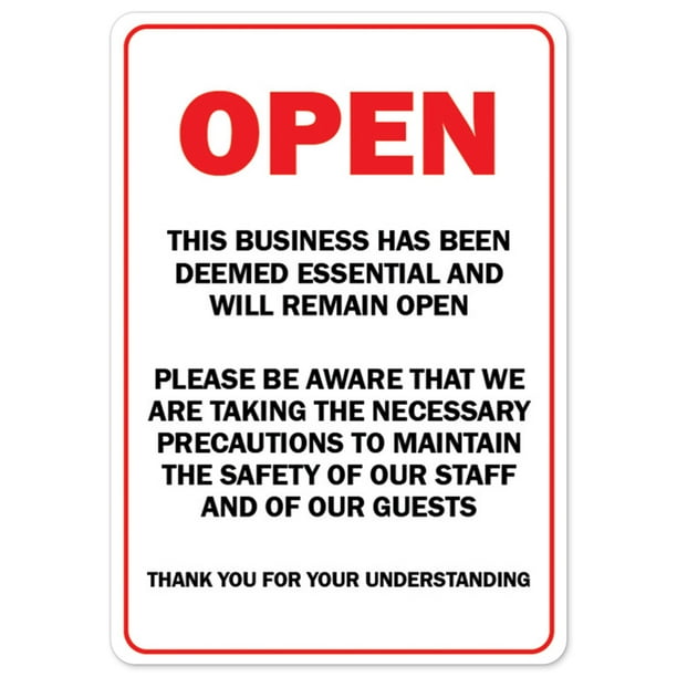 Public Safety Sign Open This Business Has Been Deemed Essential And Will Remain Open Vinyl Decal Protect Your Business Municipality Home Colleagues Made In The Usa Walmart Com Walmart Com