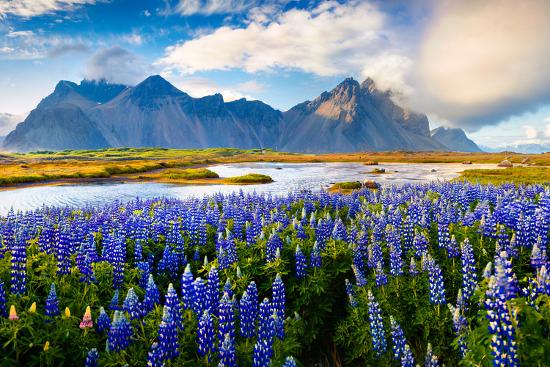 Panorama Of Blooming Lupine Flowers On The Stokksnes Headland On Southeastern Icelandic Coast Icel Photographic Print Andrew Mayovskyy Art Com
