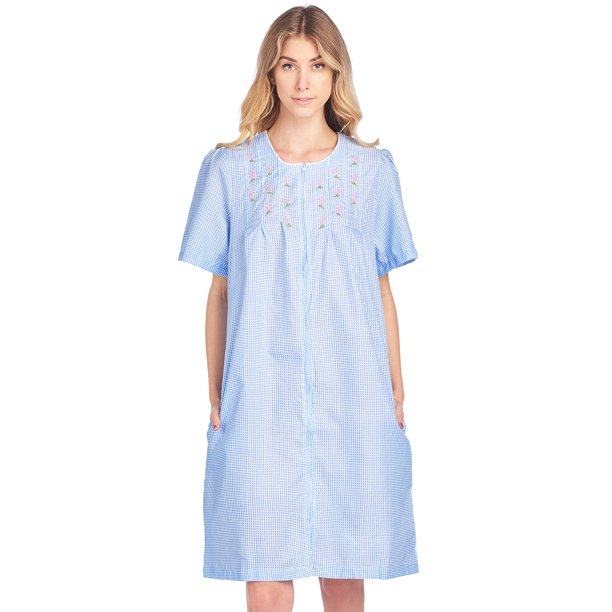 Casual Nights Casual Nights Women S Zipper Front Short Sleeve Gingham Housecoat Duster Blue Medium Walmart Com Walmart Com