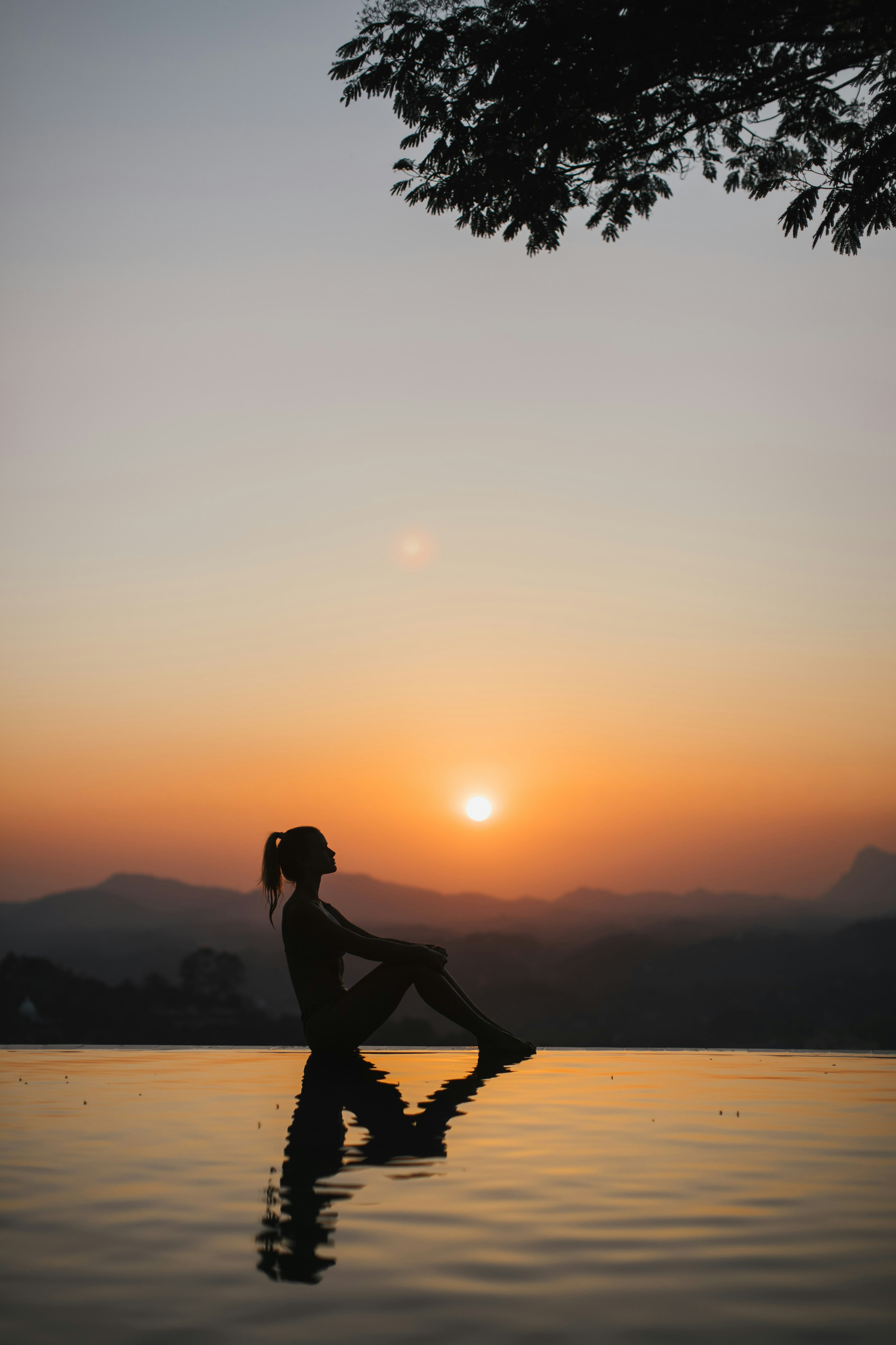 Silhouette Of Woman Sitting On Edge Of Eternity Pool During Golden Hour Photo Free Human Image On Unsplash