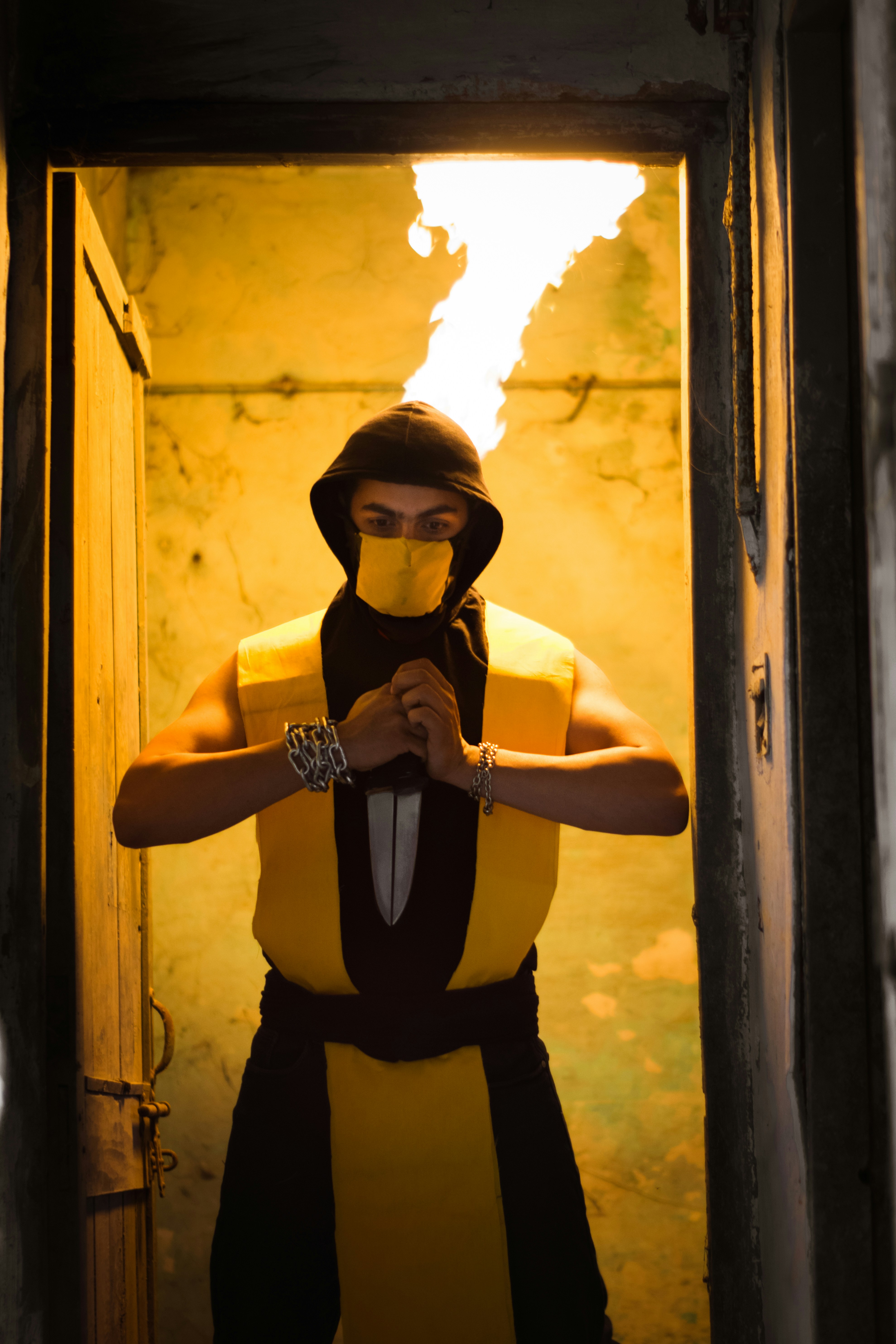 Man In Black And Yellow Suit Inside Room With Fire Photo Free Human Image On Unsplash