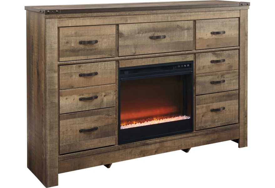 Signature Design By Ashley Trinell B446 32 W100 02 Rustic Dresser With Fireplace Insert Top Metal Banding Northeast Factory Direct Dressers