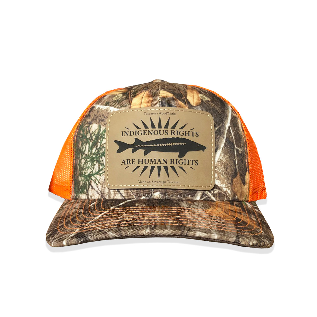 Indigenous Rights Sturgeon Camo Hat Neon Orange Tuscarora Woodworks