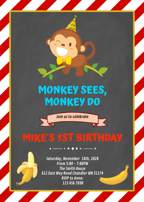 Banana And Bow Tie Monkey Birthday Invitation Template Postermywall
