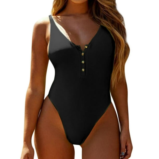 Befoka Befoka Women S Solid Color Button One Piece Swimsuit Ladies Sexy Bikini Black M Walmart Com Walmart Com