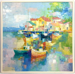 John A Manol Original Oil On Canvas Painting Houses On Lake Sailboats 24 X 36