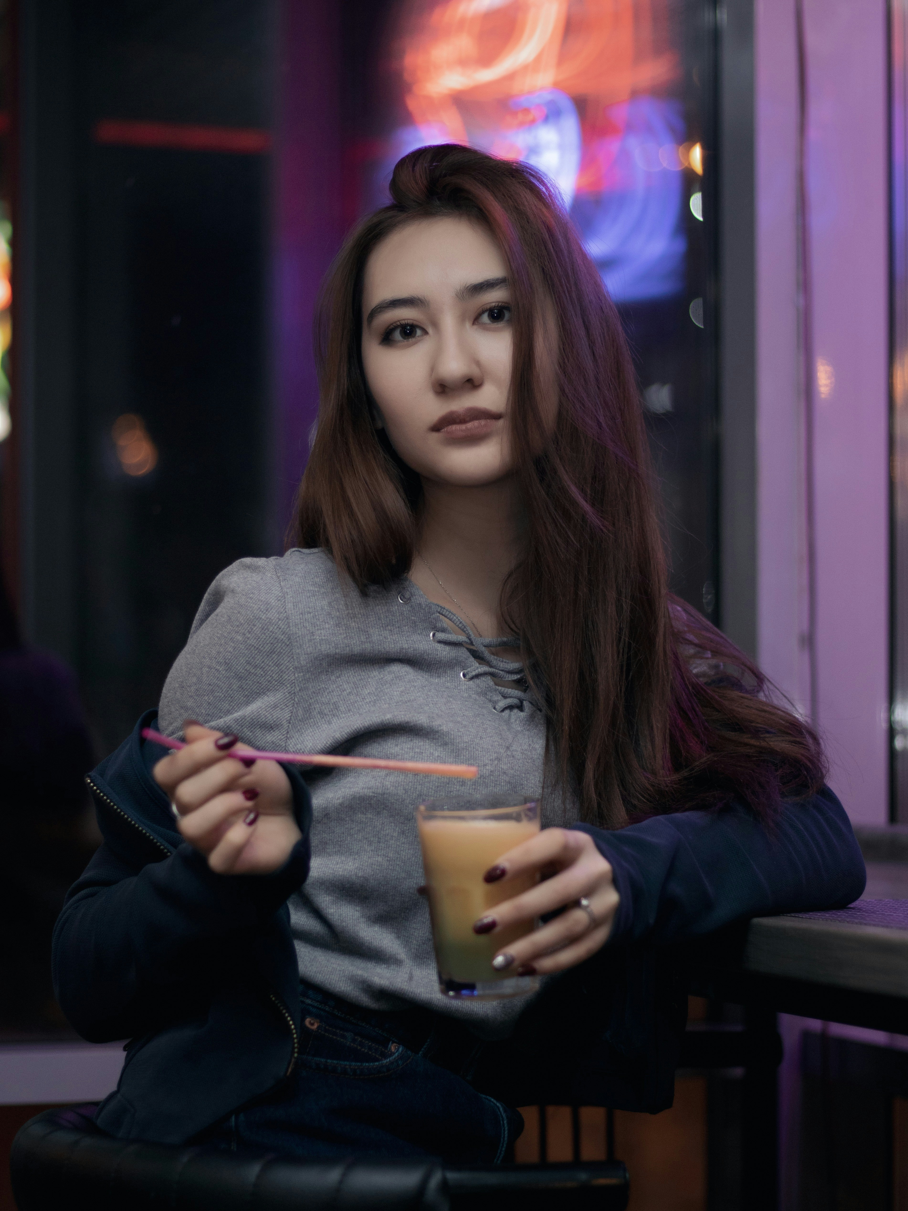 Woman Leaning His Left Elbow On Table While Holding Drinking Glass Filled With Yellow Liquid Photo Free Human Image On Unsplash