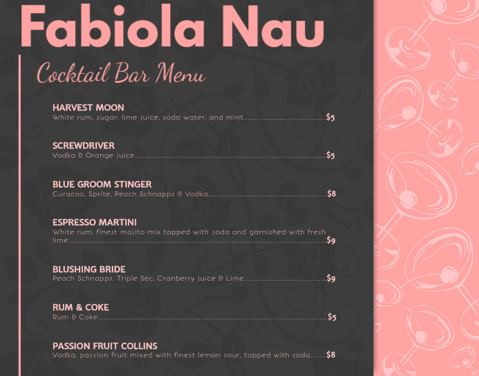 Shades Of Pink Menu Card Mysty And Bella Designs