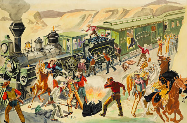 Bonhams Buffalo Bill Original Watercolor The Great Train Hold Up Bandit Hunters Of The Union Pacific