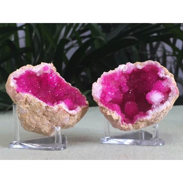 Pink Geode Pair W Stands Crystal Quartz Gemstone Specimen Dyed Morocco Geode Wish